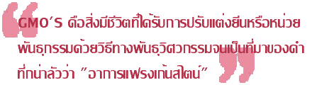 Gentically Modified Organisms คือ สิ่งมีชีวิตที่ได้รับการปรับแต่งยีนหรือหน่วยพันธุกรรม ด้วยวิธีทางพันธุวิศวกรรม